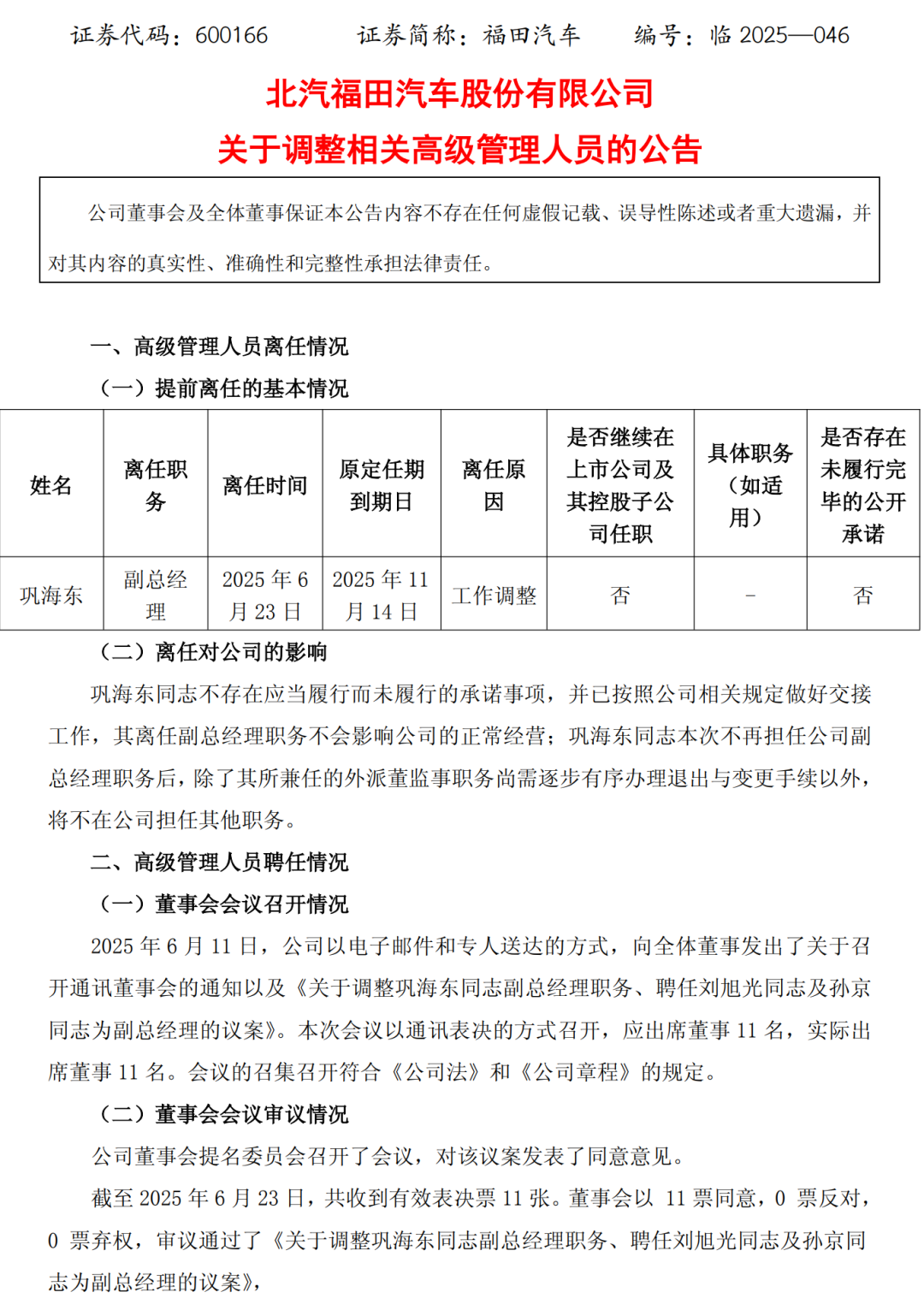 6月23日晚,福田汽车发布公告,副总经理巩海东因工作调整离任,除了其所兼任的外派董监事职务尚需逐步有序办理退出与变更手续以外,将不在公司担任其他职务。据了解,巩海东为福田汽车副总经理,原定离任时间为11月14日,离任后将不再继续在上市公司及其控股子公司任职。公告披露,福田汽车董事会提名委员会召开会议,决定聘任刘旭光及孙京为副总经理。