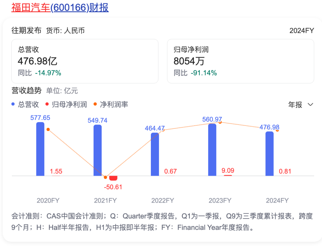 年报显示,2024年福田汽车营业收入为476.98亿元,同比下滑14.97%;归母净利润为8054.28万元,同比下滑91.14%;扣非净亏损2.13亿元,同比下滑147.21%;2024年,福田汽车毛利率为12.64%,同比增长1.77个百分点;净利率为0.09%,较上年同期下滑1.44个百分点。